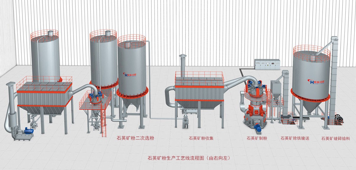 石英礦粉生產(chǎn)工藝線流程圖展示從石英礦礦石破碎、石英礦礦石提升存料、石英礦礦石輸送定量給供料進(jìn)入磨粉機、石英礦礦石磨粉、石英礦礦石磨粉選粉、石英礦礦石粉體收集...
