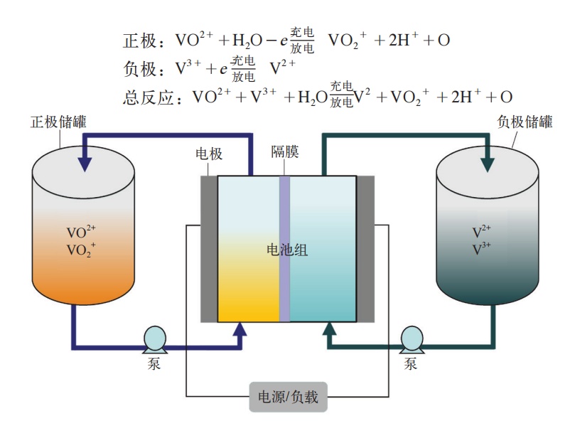 釩電池利用VO2+/VO2+、V2+/V3+兩對氧化還原電堆的釩離子溶液作為正極和負(fù)極的活性物質(zhì),分別儲存在各自的電解液儲罐中。對電池進(jìn)行充/放電時,電解液通過泵的作用,由外部儲液罐分別循環(huán)流經(jīng)電池的正極室和負(fù)極室,并在電極表面發(fā)生氧化和還原反應(yīng),實現(xiàn)對電池的充/放電。