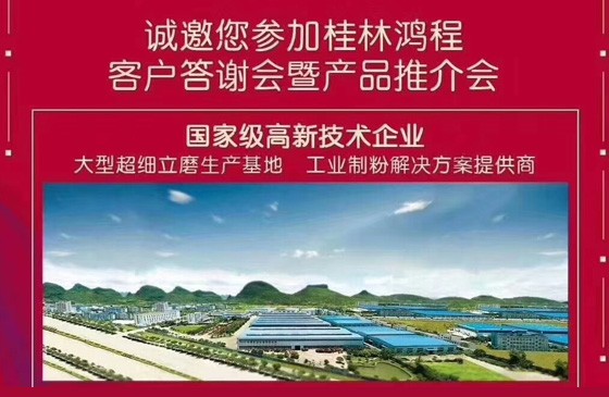 磨粉機(jī)廠家桂林鴻程公司2019年6月6日在河南南召縣舉行客戶答謝會(huì) 磨粉機(jī)廠家桂林鴻程公司計(jì)劃于6月6日在河南南召縣舉行客戶答謝會(huì)暨產(chǎn)品推介會(huì),誠邀各界人士參...